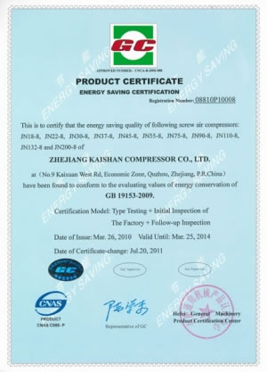 Certification d'économie d'énergie pour les compresseurs d'air JN18-8, JN22-8, JN30-8, JN37-8, JN45-8, JN55-8, JN75-8, JN90-8, JN110-8, JN132-8, et JN200-8
